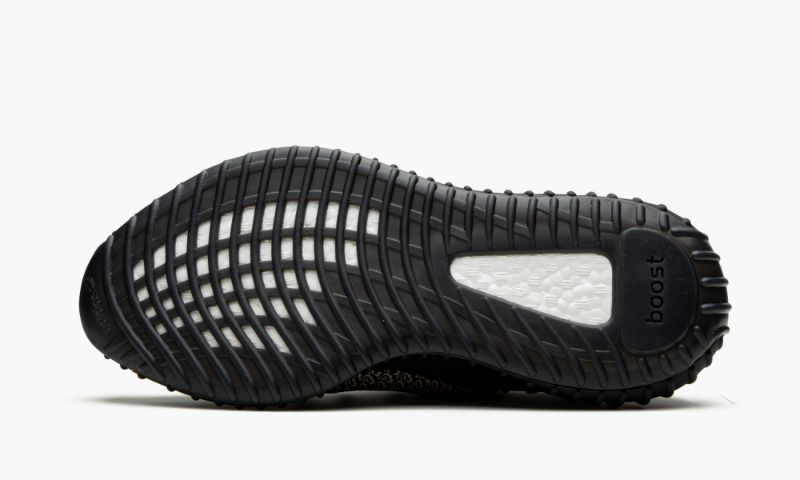 simplified two-tone knit weave of black and light pink. A solid black stripe runs across the lateral side in translucent monofilament to contrast the intricate coloration. Rounding out the design is a blacked out midsole that houses the Yeezys 350